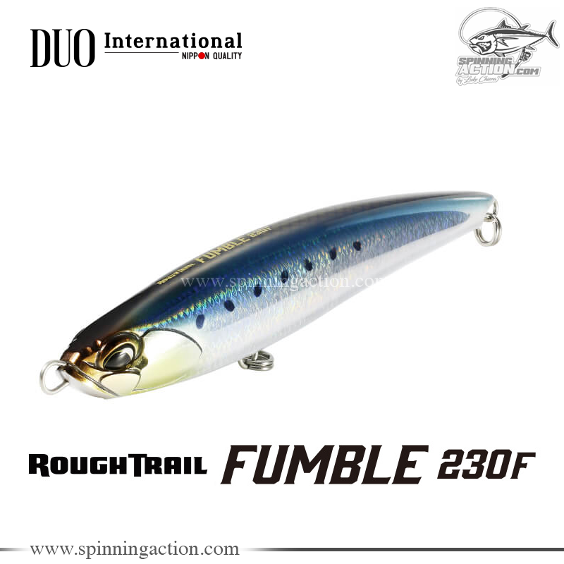 Il Rough Trail Fumble 230F della DUO è una stickbait di grandi dimensioni, utilizzabile sia per il Popping che per lo Shore Jigging estremo. La sua azione consiste in una immersione sotto il pelo dell’acqua e conseguente movimento a destra e a sinistra che fa impazzire i predatori e li invita all’attacco. Molto facile da utilizzare, basterà eseguire delle jerkate con la canna per farlo muovere nella maniera corretta. Garantisce, inoltre, una eccellente distanza di lancio ed una grande facilità di utilizzo.
